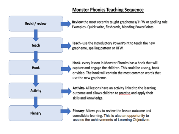 As a school we know our children well – what appeals to them and what inspires them to learn and be successful. After considering many schemes, Monster Phonics was carefully chosen because of its child-centred, interactive, multi-sensory and highly engaging nature. It facilitates learning by using monsters to group graphemes for recall and act as an easy and fun memory cue for children. It also uses colour-coding to highlight the grapheme when teaching a new grapheme. Once taught and secure, the colour is removed.